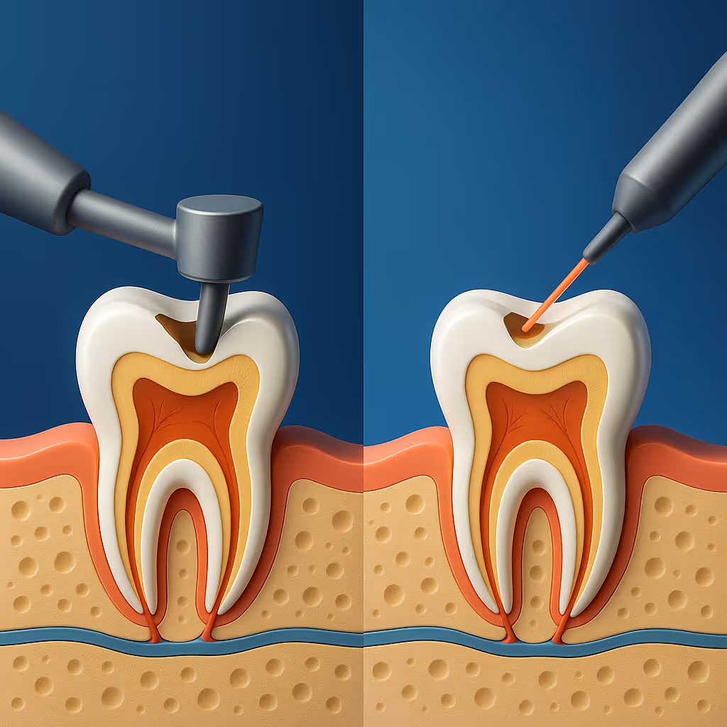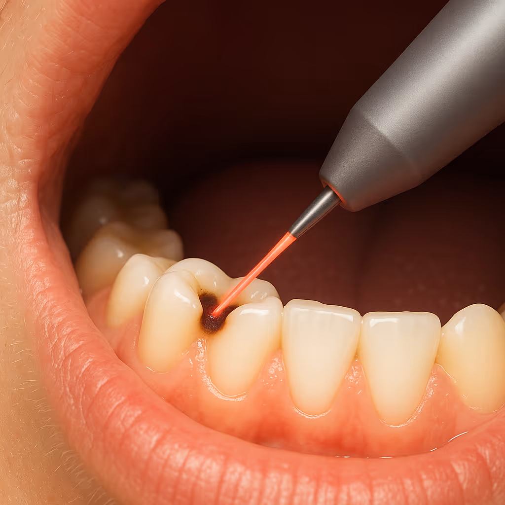 Światło lasera usuwa chore tkanki zęba bez wiercenia i drgań, chroniąc zdrowe szkliwo.